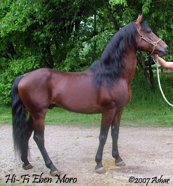 Here is one stop shopping for the discriminating breeder. If you are looking for superb disposition, type, beauty, stamina, and sport talent, in a stallion that produces himself, only better, you have found it in Hi-Fi Eben Moro. “Ben” preserves a rare sire line to Dyberry Bob and Meredith Bruce in combination with the outstanding sport champion, Royalton Ashline.